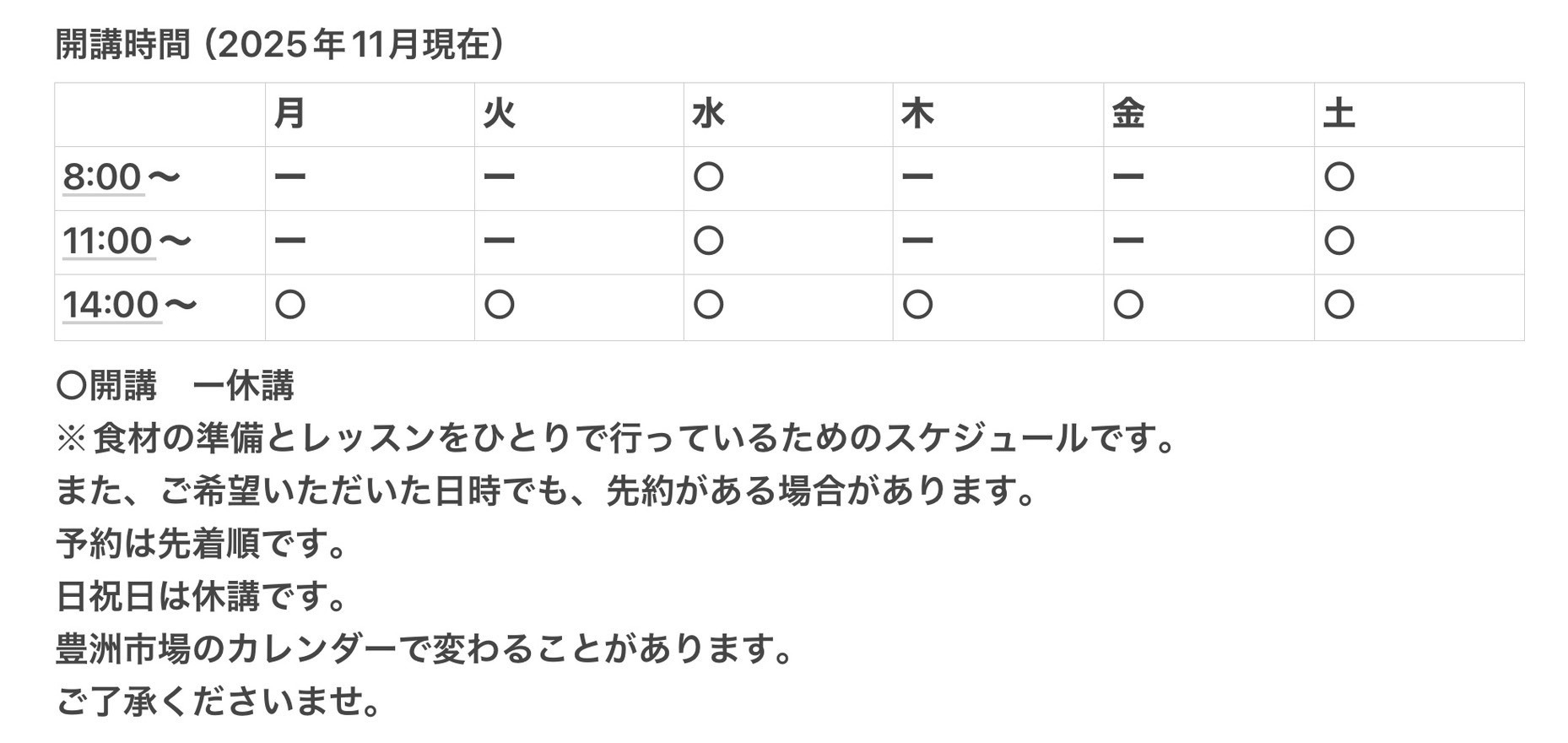 | 持ってくる物 | エプロン ハンドタオル 包丁(普段使用のものと、あればペティナイフ) まな板用ふきん2枚 キッチンペーパー・タワシ(ミニ) 未使用の使い捨て歯ブラシ マイナンバーカード、免許証または健康保険証(個人宅でのレッスンで、刃物を扱うため身分証明できるもの) 記録に必要なメモノート、スマホでのメモ、写真動画撮影に制限はありません。 持ち帰りたい場合は、容器やラップ、保冷剤などご用意ください。 |